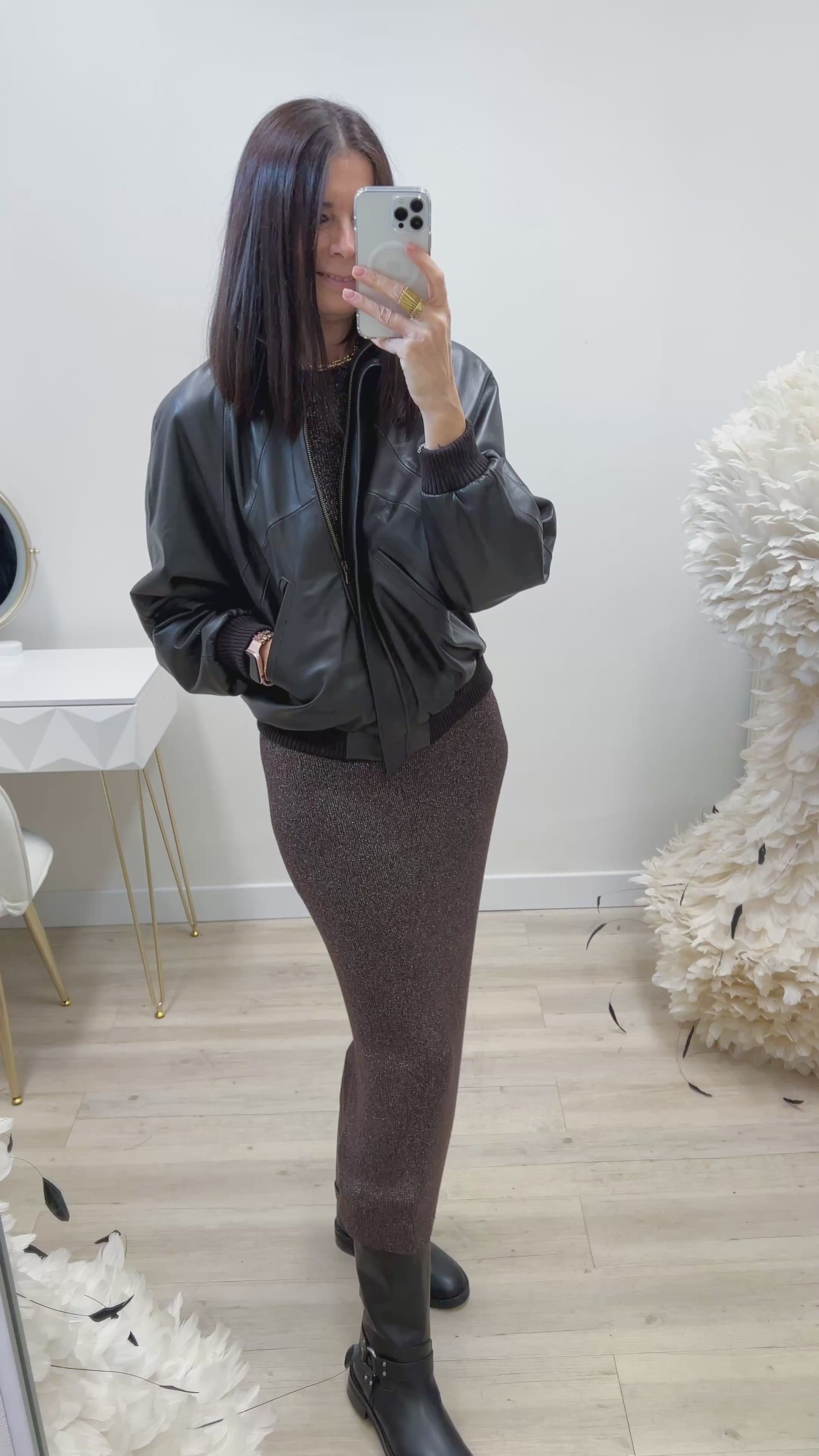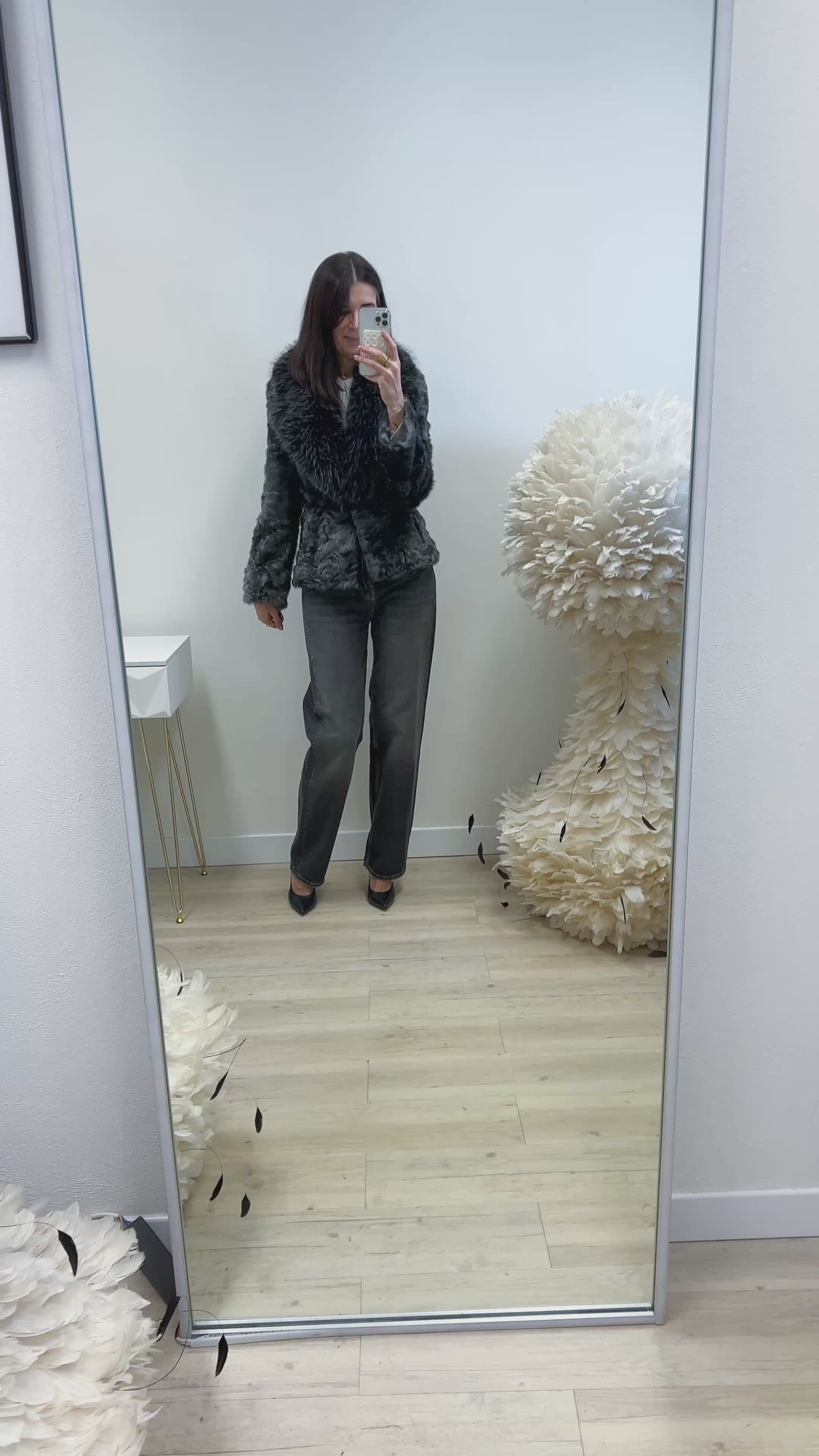 Giacca in ecopelliccia antracite, sfiancata, collo ampio e voluminoso