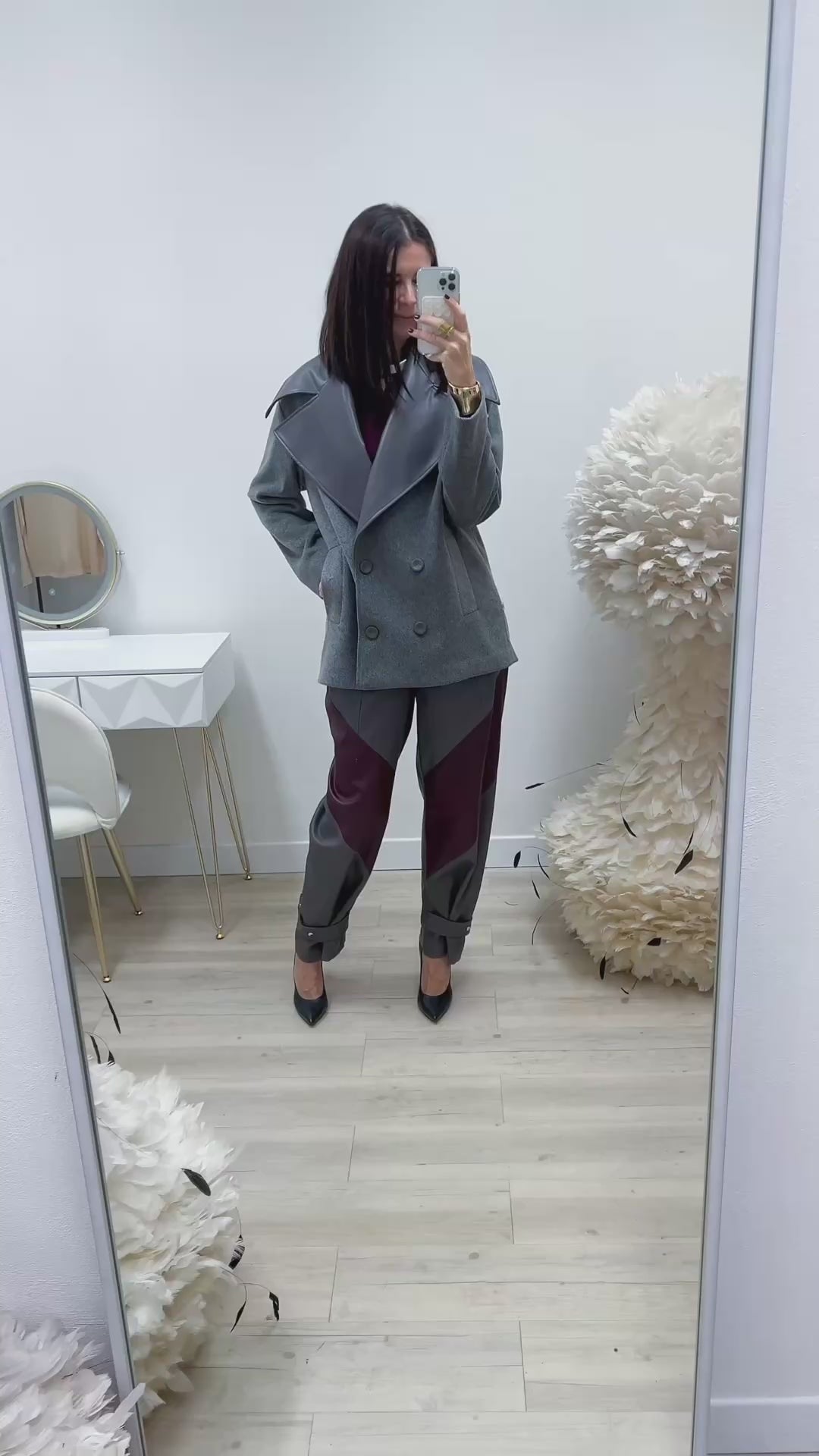 Giaccone doppiopetto, con rever a lancia in ecopelle, bottoni rivestiti in ecopelle
