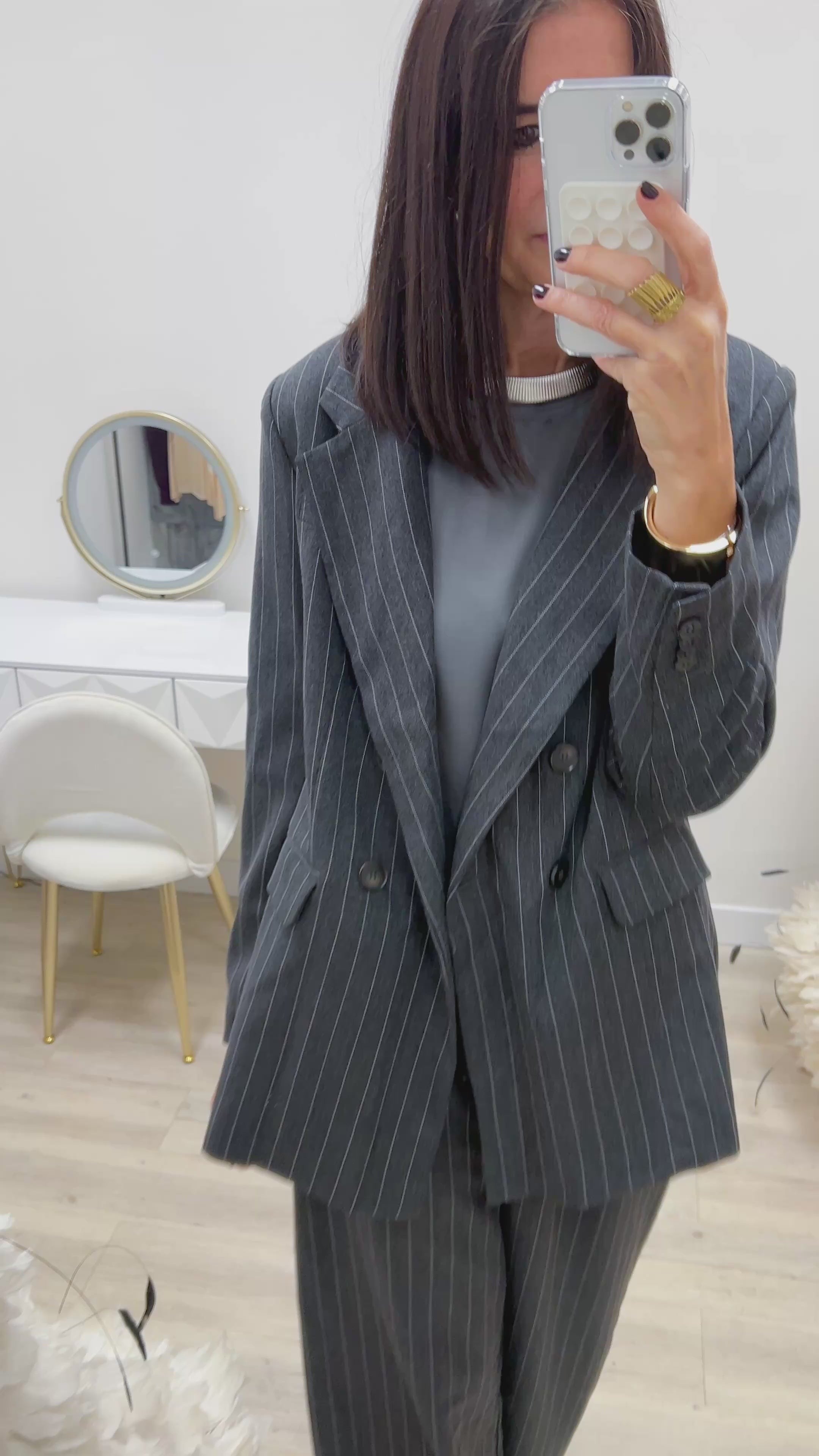 GIACCA DOPPIOPETTO, GESSATO, COLOR FUMO E RIGHINA IN CONTRASTO BIANCA, REVER A LANCIA