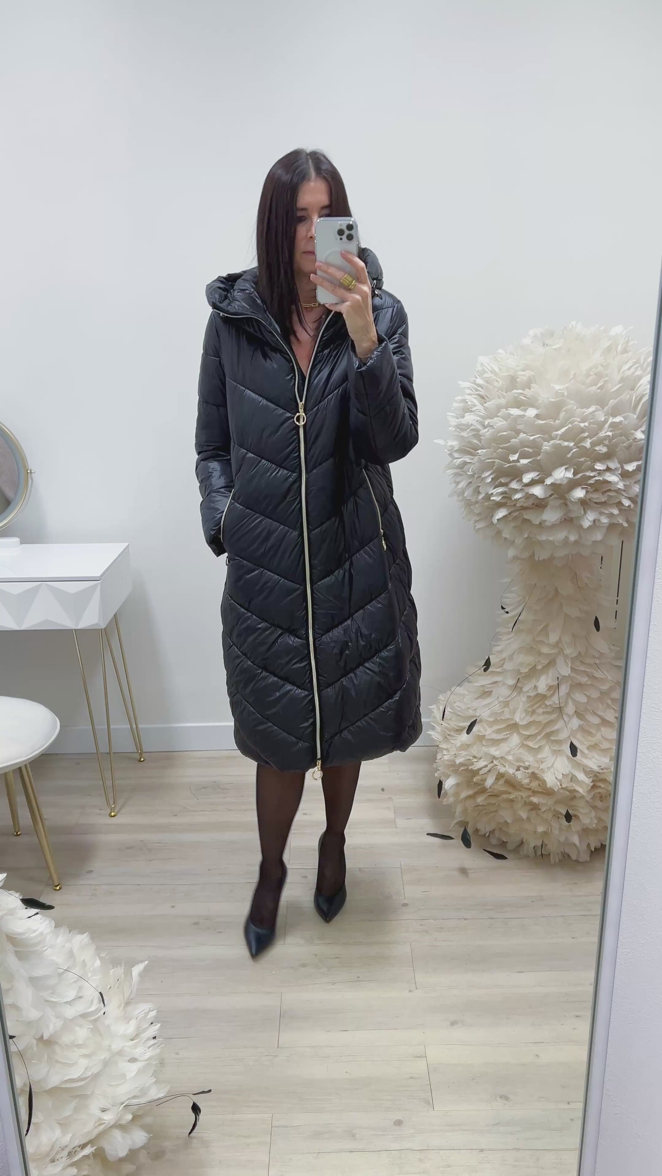 Piumino trapuntato nero lungo, vestibilita' morbida chiusura con zip (doppio cursore) , tasche a filo e cappuccio
